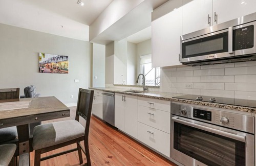 A solo 5 minutos a pie del histórico barrio francés de la ciudad, este ático de lujo de Hosteeva, ubicado en California Building y con 2 habitaciones, totalmente amueblado con interiores a medida, electrodomésticos modernos, amplio balcón y muebles cuidadosamente seleccionados, te sitúa en el corazón del jazz, la comida y Celebración de la vida. ¡Todo por lo que se conoce a Nueva Orleans!