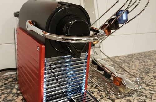 Cocina equipada con horno, vitrocerámica, microondas, tetera, cafetera nespresso, tostadora, nevera con congelador, lavavajillas, y todo lo necesario para cocinar y comer.