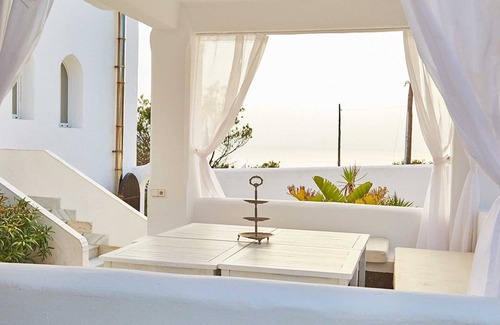 La villa, construida en el estilo morisco está situado en un promontorio rocoso que domina una extraordinaria vista del mar occidental. Aquí podrá disfrutar de los más bellos atardeceres. La vista se extiende lejos de la costa y se posó mittedrin el legendario 'Es Vedra', una roca de subidas empinadas con su altura 389m desde el agua. Un impresionante telón de fondo y una casa extraordinaria.