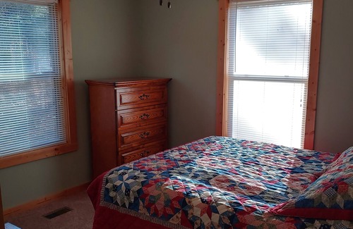 Este baño de 2 habitaciones y 2 tiene un sótano de huelga completo y una cubierta envolvente. El piso principal cuenta con hermosos pisos de madera, techos altos y 2 habitaciones, cada una con una cama queen. El sótano de salida tiene una habitación familiar y dormitorios. En los dormitorios hay un conjunto de literas adyacentes a una cama king. La habitación familiar está equipada con un sofá y un sofá de dos plazas, ambos con camas plegables.