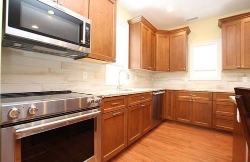 • La casa cuenta con madera de porcelana como pisos de baldosas, pisos de madera, encimeras de granito y diseños de azulejos personalizados en la cocina y todos los baños.