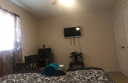 Moderna suite privada para invitados con su propia entrada, su propio baño, todos los electrodomésticos importantes (TV, refrigerador, microondas), con entrada privada a través del garaje y solo conectados a la casa principal por una puerta que siempre está cerrada. Wi-Fi de alta velocidad, un dispositivo Roku con YouTube, Netflix, Hulu, HBO, etc. y una tonelada de canales a través de la aplicación Spectrum. A menos de 10 minutos de UCF, a 20 minutos del aeropuerto, a menos de 30 minutos de Universal, Disney World y el Centro de Convenciones.