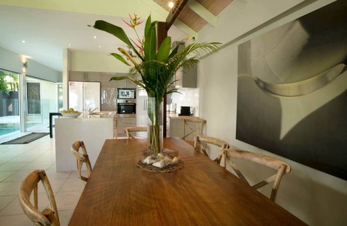 El lado de la piscina de la propiedad se abre a través de grandes puertas plegables de vidrio, lo que le brinda una sensación de espacio y flujo que se adapta a nuestro estilo de vida tropical. Bájese junto a la piscina o socialice en la enorme área de entretenimiento al aire libre admirando las hermosas vistas del mar de Coral a Dunk Island y más allá.