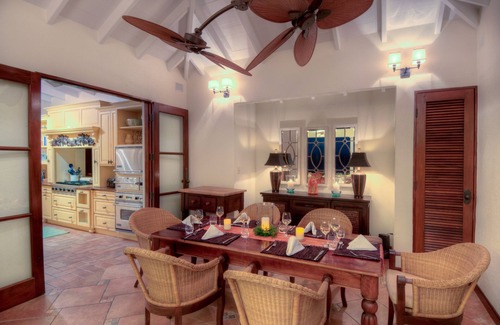 En el corazón de la propiedad se encuentra la gran casa con gran espacio de vida, áreas de comedor / sala de estar interiores y exteriores, cocina gourmet con todas las comodidades que esperaría, incluyendo una estufa vikinga de 6 quemadores, lavavajillas, cajón calefactor y refrigerador bajo cero. La comida se puede disfrutar en el comedor formal o en el comedor exterior con vistas a la piscina de borde infinito. El área del patio está equipada con una cocina al aire libre con parrilla de gas y horno de pizza, así como una mesa de comedor hecha a mano indonesia colocada bajo una pérgola sombreada perfecta para experimentar las espectaculares puestas de sol del Caribe.