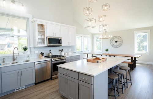 Cinco habitaciones - 2 habitaciones con una cama King en cada una; 2 habitaciones con dos camas queen en cada una; 5 º dormitorio con dos juegos de literas (cama de tamaño completo en la parte inferior, doble en la parte superior). Baño separado para cada habitación!