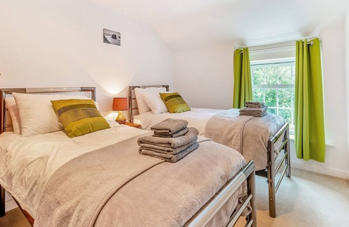 Shower room: With shower cubicle and toilet.. Electric central heating, electricity, bed linen, towels and Wi-Fi included. Initial fuel for wood burner included, remainder available locally. Travel cot and highchair available on request. Stairgate. Welcome pack. Enclosed garden with decking and garden furniture. Bike store. Private parking for 2 cars. No smoking. Please note: There are a few steps to the decking. . As you enter the cottage, you are greeted by a warm and inviting living room adorned with an atmospheric wood burner, perfect for curling up on chilly evenings. The open plan kitchen and dining area provide a delightful space for socializing and preparing delicious meals. Downstairs, the flagstone flooring and beamed ceilings add a touch of rustic charm, creating a cosy atmosphere throughout. Upstairs, you’ll find a double bedroom, a twin bedroom as well as a single, ensuring comfortable accommodation for up to five guests. The cottage also features a convenient shower room, offering modern amenities for your comfort.