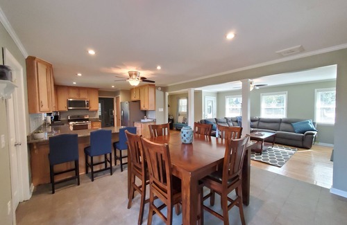 Hermosa casa estilo rancho con plano de planta abierto en un lote enorme en el histórico norte de Augusta. 3 dormitorios (cuarto disponible a pedido) con TV, 3 baños completos (uno de cada 3 de los dormitorios) y una oficina. Las áreas de sala de estar, cocina, desayuno y sala de estar están abiertas con puertas dobles francesas que se abren al porche trasero. Hay mucho estacionamiento en una gran área plana y un garaje para dos autos. El dormitorio principal y el baño son accesibles para sillas de ruedas. Wi-Fi, DirecTV, Netflix, Disney +, Hulu y ESPN + incluidos con el alquiler. A solo 3. 4 millas del campo, a 2 millas del centro de Augusta, a 3. 5 millas del aeropuerto regional de Augusta, ya solo minutos de muchos restaurantes, campos de golf y lugares de entretenimiento.