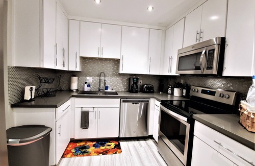 Nuevo remodelación completa y mobiliario. Duerme y tiene capacidad para 9 invitados cómodamente. Patio trasero con piscina privada. Cocina de cocineros, 2 áreas de entretenimiento separadas (el área de TV no se muestra en la foto, ya que estamos esperando que lleguen los accesorios), una con sección, 2 sillones y TV de pantalla plana de 55 ", la segunda área para conversar con un sofá y 2 sillones. Comedor independiente. 4 habitaciones cada una con colchones, armarios, tocadores, mesitas de noche, lámparas y ventiladores de techo. 2 dormitorios principales cada uno con camas king y baño privado con duchas y televisores de pantalla plana. Una habitación con cama queen y TV de pantalla plana. Y una habitación con 2 camas Twin XL (se puede convertir en una cama King). Baño en el pasillo con bañera / ducha para compartir con las habitaciones Queen y Twin XL. Se puede colocar un rollo XL Twin muy cómodo en la habitación de invitados de gran tamaño o en el pasillo adyacente a la habitación principal. Cuarto de lavado con lavadora y secadora de carga frontal, y plancha / tabla.