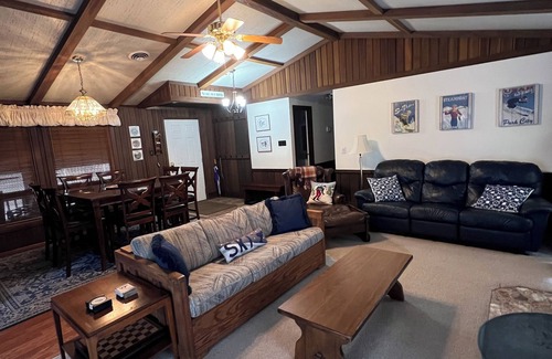 La casa tiene una habitación llena de estar con 2 sofás, estufa de leña y TV en color con un reproductor de DVD. También hay una cocina completa con fregadero grande, horno, estufa, microondas, tostadora, horno, waffle cafetera, el café y los fabricantes de té helado, y una nevera. Todos los utensilios de cocina siempre. Con capacidad para 8 en la mesa de comedor, así como 3 taburetes de la barra. Gran porche con mecedoras y parrilla de gas.