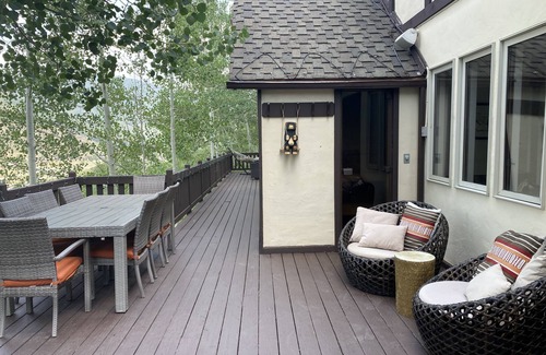 Nuestro semidúplex de 4,100 pies cuadrados está ubicado en lo alto de una hermosa ladera del vecindario Highland Meadows en West Vail y es el lugar perfecto para grupos familiares o aventureros. 3 niveles distintivos ofrecen un plano de planta único con 4 habitaciones más un gran loft con 4 1/2 baños que permite que los grupos se extiendan y se reúnan al mismo tiempo. Un gran comedor y una gran sala se combinan con grandes ventanas y techos estilo catedral, muebles de diseño, chimenea y un sistema de TV / entretenimiento HD de 65 ". ¡Encuentre un libro o una cerveza en la biblioteca inspiradora con kegerator incorporado! Relájese o juegue juegos en el sótano en la sala de juegos / multimedia con TV de 55 "y chimenea. Deje que los niños se diviertan en la zona de juegos 'SOLO PARA NIÑOS'. Disfrute del desayuno en la cocina en el banquete personalizado. Salga a una cubierta envolvente masiva con vistas a la montaña que es perfecta para después del esquí, puestas de sol y observación de estrellas e incluye una bañera de hidromasaje hundida para 7 personas, una clásica sauna / baño de cedro, altavoces al aire libre y gas barbacoa - todo rodeado de árboles maduros de Aspen.