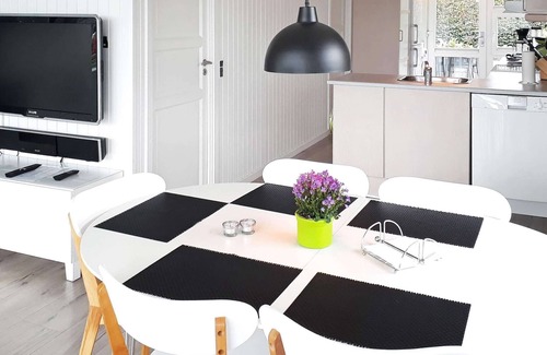 Layout: cocina abierta(fogón(eléctrico), campana extractora, cafetera, microondas, lavavajillas, nevera, congelador(60-99L)), salón-dormitorio(TV(cable, canales de televisión alemanes, canales de TV daneses), reproductor de DVD, reproductor de CD, instalación estéreo, trona), dormitorio(cama doble, cama infantil), dormitorio(cama doble), dormitorio(2x litera), cuarto de baño(bañera o ducha, lavabo, váter, lavadora), aparcamiento cubierto , sauna(4 personas), calefacción(radiador(es) eléctrico(s)), terraza, jardín, barbacoa, juegos infantíl, mesa para limpiar el pescado, bomba de calor aire-aire