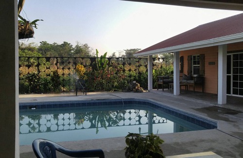 Recién remodelado super limpia e inmaculada 900 pies cuadrados Casita con dos dormitorios (1 Queen, 1 doble), baño alicatado completo con ducha de tamaño doble y dos lavabos, cocina completa con estufa de gas, nevera, microondas, exprimidor profesional, tostadora, cafetera, etc..2 unidades de aire acondicionado, pantalla plana de TV, cable, WiFi, y la mayor piscina privada en Punta Gorda. Venga a relajarse y tomar el sol en una hamaca, ver bandadas de loros y otras aves locales, escuchar a los cercanos monos aulladores y disfrutar de la década de luciérnaga en la noche. árboles frutales y un precioso paisaje en su lugar. Este no es un destino "turístico", se trata de una casa privada en una calle apartada copia de seguridad en contra de la selva que le proporciona la más privada escapada relajante que puede obtener. Hay otra más pequeña Casita también en la propiedad se puede alquilar a un costo adicional para grupos más grandes.