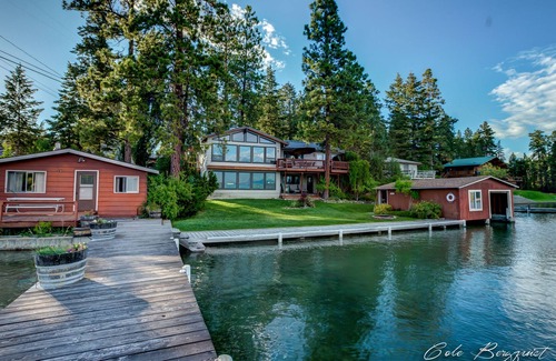 The Kings Point House es una propiedad a orillas del lago único con muelle grande en forma de U y el césped en pendiente. La casa ha sido recientemente redecorado en un estilo informal pero Montana lujoso y contemporáneo. La vista de Flathead Lake y las montañas de la misión se quita el aliento y se puede ver desde las ventanas enormes en casi todas las habitaciones de la casa. Lo llamamos 'Lago de TV' porque la vista y el desfile de la vida silvestre es siempre cambiante con el águila pescadora agraciado, picada águilas calvas, patos y gansos, y por supuesto los ciervos del barrio. El Greatroom tiene una gran chimenea de piedra y una mesa de comedor con capacidad para doce registro, se abre a una terraza con asientos y descansando bajo un árbol de pino Ponderosa. El salón de la planta baja es la cabina retro con una chimenea de leña en contraste con un televisor de pantalla plana de 42 pulgadas.