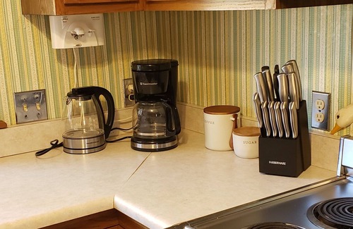 Al ingresar a la cabaña, hay un área conveniente para quitarse las botas, colgar una toalla mojada o simplemente colocar todos sus abrigos juntos. A través de la puerta, usted será inmediatamente capturado por la magnífica vista desde la ventana grande a través de la sala de estar. Vea el espacio ideal para que su familia comparta comidas en la hermosa mesa de madera, directamente frente a la cocina bien surtida. La cocina tiene todas sus necesidades básicas, además de algunos electrodomésticos pequeños adicionales, como una micro-parrilla y una licuadora. A diferencia de muchos alquileres de vacaciones, esta casa de campo en realidad tiene un lavaplatos y aire acondicionado, aunque las habitaciones de arriba todavía calientan en verano. El aire acondicionado funciona bien solo en el piso principal y en las áreas de sótano salientes. La vista del pequeño césped y los árboles de los alrededores es ideal cuando quiere ver a sus niños jugar un juego de césped.