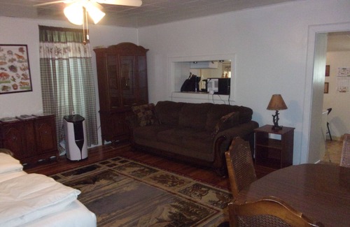Disfrute de un ambiente arbolado en nuestra cabaña de troncos histórica original. Recientemente renovado y directamente en la ciudad. Un dormitorio con cama queen size, un nuevo sofá cama queen en una gran sala de estar con suficiente espacio para una cama queen también. Chimenea de gas recientemente renovada, horno nuevo y aire acondicionado de ventana. La cocina está totalmente equipada con lo esencial para preparar comidas simples, una nueva gama de gas y una nevera de tamaño completo. Se proporcionan ropa de cama y toallas. El estacionamiento está disponible directamente en frente de la propiedad.