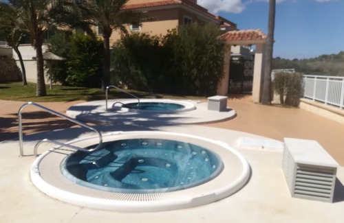En el exterior a unos 10 metros de la vivienda se encuentra unas zonas ajardinadas por las cuales se accede mediante llave. Y que tienen en su interior una piscina de 25x10 metros, separada en dos con distintas profundidades para niños y adultos. También se puede disfrutar de dos jacuzzis que funcionan perfectamente y duchas, todo esto se trata de zonas comunitarias en la que el acceso está permitido desde las 09.00 hasta las 22.00.