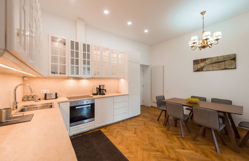 El apartamento está ubicado en el segundo piso (con el código de la puerta, sin ascensor) y cuenta con todo lo que uno puede necesitar para una estadía de lujo en Brasov. La sala de estar cuenta con un amplio sofá y dos sillones, televisión de alta definición de 42 pulgadas con cable (más de 100 canales, incluyendo inglés, alemán e italiano), acceso a Internet WIFI, y se abre en un gran comedor con una cocina totalmente equipada con electrodomésticos Miele (refrigerador, Lavavajillas, horno microondas, cocina eléctrica).