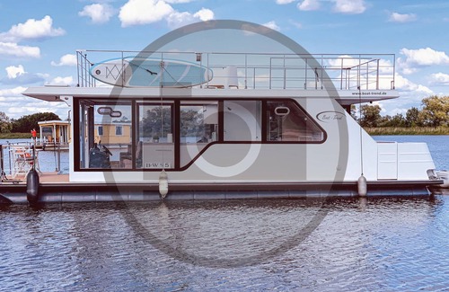 La casa flotante está totalmente equipada con WC (inodoro eléctrico), lavabo, ducha separada, cocina con fregadero, dos fogones de gas y frigorífico, zona de estar, armario empotrado y TV. Gracias a su acristalamiento integral, podrá disfrutar de unas vistas impresionantes del agua y el paisaje desde cualquier punto de la casa flotante. Lo más destacado de la casa flotante le espera en la zona exterior: la terraza de popa está equipada con una moderna cocina exterior con nevera, fogones y fregadero, para que pueda cocinar y comer aquí al aire libre cuando haga buen tiempo. Desde la popa de la casa flotante, una escalera exterior conduce a la azotea, donde una maravillosa terraza se extiende por toda la zona habitable.