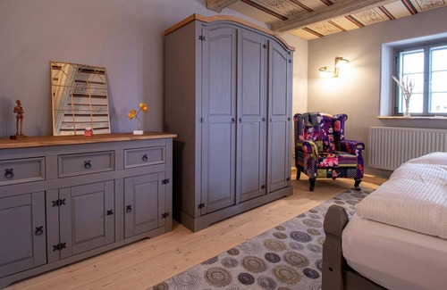 La casa, que ha sido ampliamente renovada y restaurada bajo la supervisión de las autoridades monumentales, con su hermosa bodega abovedada con iluminación indirecta, permite disfrutar de agradables veladas con deliciosa comida, vino y cerveza. La renovación se llevó a cabo con materiales de construcción ecológicos de arcilla, que garantizan un clima interior saludable y sin productos químicos. Los dos techos de tablones de 500 años de antigüedad, uno de ellos incluso pintado a mano, son especialmente bellos. Se vive en un pequeño museo, por así decirlo, con una gran cocina equipada con todo lujo de detalles, modernos muebles de madera maciza al estilo de una casa de campo y un exclusivo cuarto de baño con bañera exenta y amplia ducha.
