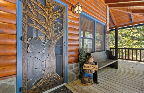 Las hermosas vistas de la montaña en capas de largo alcance y el rico tema de los nativos americanos hacen que esta cabaña sea muy especial. Disfrute de un baño en el jacuzzi al aire libre o relájese en la terraza con vista a tres cadenas montañosas. Acurrucarse en la sala de estar al lado de la chimenea de leña de gas de la chimenea en la sala de estar, o al lado de la chimenea de leña en el exterior. La cabaña también ofrece una hermosa chimenea de gas de leña en el dormitorio principal con porche privado con mosquitero. Patio trasero cercado, cocina totalmente equipada, base para iPod, televisores de pantalla plana, estéreo con CD. Cerca del lago Blue Ridge y el lago Nottley