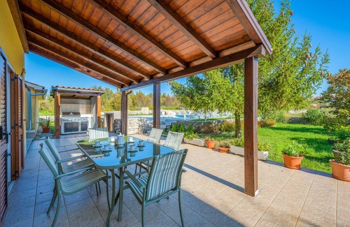 Esta hermosa casa de vacaciones con piscina se encuentra a unos 15 minutos en coche de las playas más bonitas de Istria, que están en el pueblo de Rabac. El jardín está en la parte trasera del edificio y tiene una terraza cubierta donde se puede pasar muchas horas al aire libre junto a la piscina. Hay tres dormitorios en la planta baja, mientras que otro dormitorio independiente con su propio cuarto de baño y entrada se encuentra en la planta baja. Los interiores están amueblados con muebles sencillos de estilo clásico. Visite los lugares de los alrededores, como el casco antiguo de Labin y déjese encantar por las pequeñas callejuelas con sus galerías. Desde aquí también se puede llegar fácilmente a los balnearios de Duga Uvala, Prtloga, Sveta Marina y Ravni. Haga una excursión de un día al histórico anfiteatro de Pula o a las islas Brijuni.