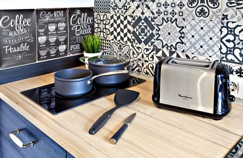 La cocina está equipada con diversos utensilios de cocina, como microondas, cafetera, frigorífico, menaje y vajilla.