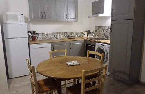 . Una agradable sala de estar con una cocina totalmente equipada (refrigerador, congelador arriba, lavaplatos, lavadora-secadora, horno, microondas, campana extractora, productos de limpieza, un comedor, un área de descanso con sofá cama (colchón grueso 140x190),