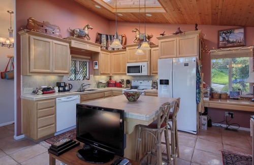 Abra la puerta principal para descubrir la sorpresa de un retiro lleno de arte: acogedor, espacioso y visualmente impresionante. Ubicado en el flanco de la Colina del Parque de Cambria, este refugio lleno de luz está lo suficientemente cerca del océano como para que puedas ver y escuchar las olas que se estrellan en la playa Moonstone. Está justo arriba de Shamel Park, a pocas cuadras de los extensos senderos de Fiscalini Ranch y a 15 minutos a pie de las tiendas y restaurantes de West Village. Esta casa es ideal para un fin de semana romántico para dos, un retiro de escritura individual o una escapada divertida para la familia y los amigos. La casa de planta abierta está rodeada de espacios verdes en todos los lados, lo que la convierte en un refugio tranquilo con vistas al océano, a los pinos y a las colinas costeras a través de las numerosas ventanas. También puede ver una gran extensión de estrellas a través de tragaluces de gran tamaño. La gran terraza es perfecta para el té de la mañana, la lectura de la tarde o la puesta de sol después de un día de cata de vinos en el cercano Paso Robles o en un recorrido por el Castillo Hearst en San Simeon. Cada una de las dos habitaciones pequeñas tiene una cama queen y baño / ducha. Dos cómodos colchones de aire con ropa de cama también están disponibles. La casa está equipada con una cocina bien surtida, un bonito piano vertical, WiFi, TV con DVD, cable con HBO y Showtime, muchos libros y un estéreo. TOT # 6004416