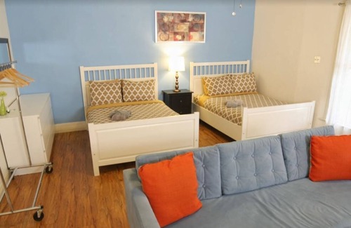 La habitación es privada y tiene dos camas matrimoniales y un sofá, perfectos para hasta 5 adultos. Viene con un Smart TV de 55 'pulgadas. Podrá acceder a la cocina, baño, dos salas de estar y un pequeño patio delantero. Estacionamiento en la calle solamente.