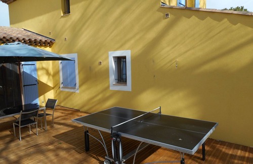 Gran terraza de madera orientada al sur con espacio sombreado, mesa de ping pong