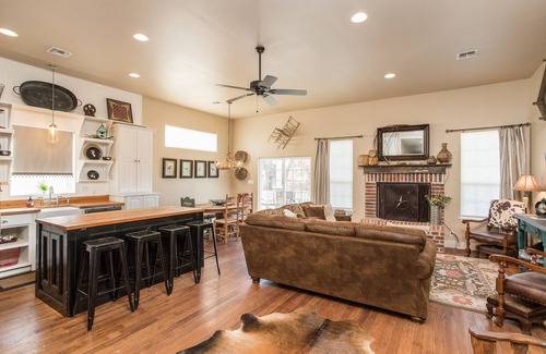 Permiso # ** FBGTX-15503 ** Hermosa casa de una planta de 2054 pies cuadrados construida en 1920 completamente remodelada en 2012. Un amplio vestíbulo saluda a los visitantes que se abre a una acogedora sala de estar. Largos pisos de pino, con techos de 11 + Ft. Amueblado en un estilo Hill Country relajado con asientos de cuero, alfombra de piel de vaca y otras piezas vintage con un toque femenino atemporal. Dos porches cubiertos con muchos asientos para disfrutar de un café por la mañana o un vino por la noche.