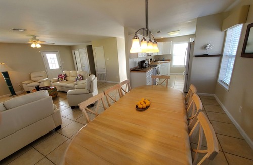 Esta casa de playa muy cómoda tiene vista al mar y domina la piscina en el vecindario de Sand Point con restaurante, piscina, jacuzzi, paseo marítimo y acceso al carrito de golf. Y con cuatro camas queen y cuatro camas para niños, nuestra casa Anchor House / Guest Quarters de cuatro dormitorios (más loft) y tres baños es el lugar perfecto para tres o cuatro parejas con niños.