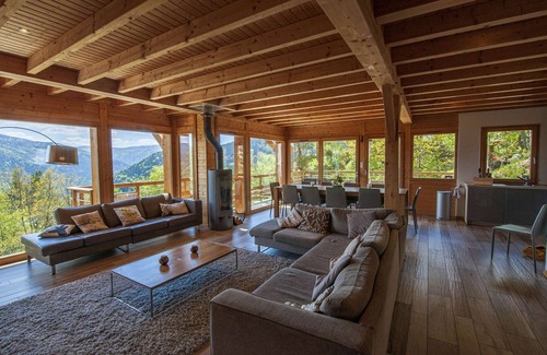 El salón constituye un gran espacio de 50 m2 abierto a una cocina americana totalmente equipada. Alrededor del fuego de leña crepitante en la estufa escandinava, cómodamente instalado en los sofás grandes y acogedores, alrededor de un cristal, se le ofrece el espectáculo de una naturaleza grandiosa a través de ventanas panorámicas.