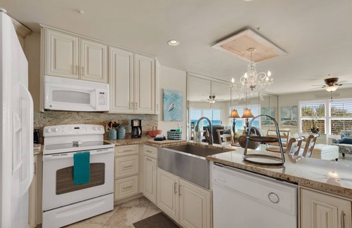 La paleta de blanco antiguo suave, con toques de color turquesa complementar la hermosa vista del Golfo desde su sala de estar, sofá cama Queen, dos sillas 'cómodos' y un centro de entretenimiento con TV / DVD / STEREO / de alta velocidad a internet inalámbrico. Podrá disfrutar de esta unidad recientemente decorado, garantizó !!!!