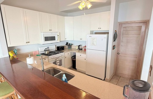 La cocina está en la parte trasera de la gran habitación, pero también comparte la magnífica vista. La cocina está totalmente equipada con nevera, cocina de gas, lavavajillas y microondas. En la parte trasera de la cocina hay una despensa y una lavadora / secadora y una parrilla de gas está en la cubierta superior.