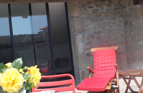Una escalera de hierro da acceso a la pasarela con área de relajación (cama de 90 cm) y a la terraza privada de 40 m2 sin opuesto y una vista impresionante de los valles circundantes. Desde allí puedes ver los 3 valles y las montañas Tanargue. El exterior está equipado con una mesa, sillón, barbacoa eléctrica y un viejo fregadero de piedra.