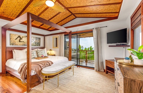 Tranquilidad en su máxima expresión, nuestra casa estilo centro turístico te relajará en el momento en que cruces sus puertas hacia las amplias vistas al océano de 180 grados. Nuestra casa fue construida por los mismos constructores que el Hualalai Four Seasons aquí en la Isla Grande. Está ubicado justo detrás de 5 acres de Kona Coffee & MacNut Farms para la máxima privacidad. Nuestra piscina climatizada y spa son el lugar ideal para ver un atardecer de Kona. A una altura de 1200 pies, nuestros espacios interiores / exteriores son cómodos durante todo el año.
