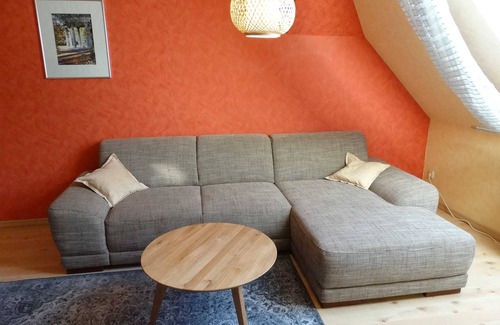El apartamento está ubicado en el piso superior (ático) de una casa de ladrillo renovada construida alrededor de 1900. El apartamento amueblado de forma contemporánea y confortable consta de una sala de estar y dormitorio, una cocina funcional y un baño con ducha brillante. El tamaño del apartamento se basa en la regulación del espacio habitable, d. h. las áreas debajo de los techos inclinados con una altura entre 1 metro y 2 metros se cortaron por la mitad y las áreas con una altura inferior a 1 metro no se tuvieron en cuenta en absoluto. Además del equipamiento del apartamento, puede utilizar el gran jardín, que está disponible para usted con sus árboles frutales sombreados, una zona de descanso y el gran prado con portería de fútbol. Una parrilla también está disponible para su uso.