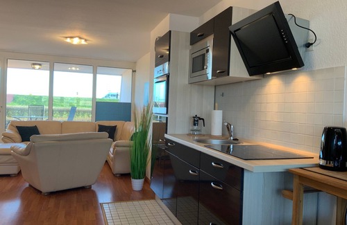 Nuestros apartamentos en Wilhelmshaven en South Beach están ubicados exactamente donde puedes escuchar las olas del Mar del Norte y el Watt comienza en su diversidad única y vibrante justo en tu puerta. Sin embargo, usted está en el centro del centro de vacaciones. Desde los apartamentos está a solo unos pasos del paseo marítimo con sus cafés y restaurantes. Disfrute del estilo de un apartamento excepcional con vistas al mar y acceso directo al dique de la playa.