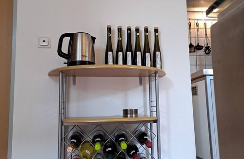 En la sala de estar hay una pequeña tienda de vinos para los amantes del vino, con vinos seleccionados de bodegas conocidas. Bajo petición, se puede organizar una cata de vinos. Para el entretenimiento hay un pequeño sistema de alta fidelidad, reproductor de DVD y una colección de juegos disponibles. W-LAN es, por supuesto, gratis. En el área de la cocina hay una cocina con estufa de 2 placas con vitrocerámica, nevera-congelador. Además, la cocina está equipada con suficientes utensilios para cocinar y comer, microondas, horno pequeño, tetera, cafetera y tostadora. Aquí se pueden encontrar otras comodidades como bolsas de filtro, bolsas de basura, jabón para lavar platos y paños de cocina. El apartamento tiene una mesa de comedor para 4 personas. El apartamento tiene una habitación separada para dos personas. Todas nuestras camas tienen marcos de listones ajustables en altura. Además, una radio reloj está disponible. En el armario del dormitorio hay una caja fuerte donde puedes incluir tus objetos de valor. Para la tercera y cuarta persona hay disponible un sofá cama en la sala de estar. En nuestro baño encontrará artículos de tocador, secador de pelo, espejo de maquillaje, toallas de papel y papel higiénico. La calefacción de las habitaciones se realiza mediante un suelo radiante. Los apartamentos se completaron en 2002. La última renovación tuvo lugar en 2016. Los apartamentos tienen cada uno su propio patio con 4 sillones y un estacionamiento separado directamente en la casa. Las motocicletas se pueden estacionar en la cochera. Para sus bicicletas, hay una bodega de bicicletas disponible. Desde sus apartamentos llegará a nuestro amplio jardín con césped (tumbonas) y estanque, en el que hay numerosos Koi. También hay una zona de barbacoa, que está a su disposición. En la puerta de la bodega de bicicletas hay un dardo al aire libre donde puedes pasar el tiempo.