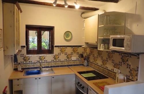 La cocina está totalmente equipada para autoservicio, con una buena variedad de vajilla y utensilios, un horno de gran tamaño, una placa de vitrocerámica de cuatro fuegos, microondas, tostadora y hervidor de agua. La cocina es limpia y moderna, con azulejos de cerámica de diseño tradicional.