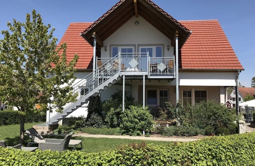 El apartamento de 90 metros cuadrados se encuentra en la planta baja y tiene una terraza cubierta. Tiene una cocina totalmente equipada con zona de comedor (lavavajillas, nevera-congelador, cocina eléctrica con vitrocerámica, microondas y varios electrodomésticos pequeños). La sala de estar tiene TV, teléfono y Wi-Fi. Una habitación está amueblada con una cama doble y otra con dos camas individuales. También encontrará en el apartamento una silla alta, una cuna y una alfombra cambiante. El baño está equipado con bañera y ducha. Un baño separado está disponible. La limpieza final, el aparcamiento y el wifi están incluidos en el precio. Una barbacoa y un césped para relajarse están disponibles. Nuestro propio estanque te invita a nadar, pasear en bote o pescar.