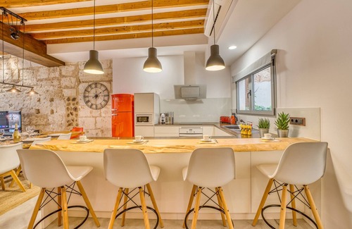 Este apartamento destaca por el exquisito gusto con el que ha sido diseñado y decorado. Ha sido completamente renovado recientemente, pero conserva el alma de su construcción original con detalles como sus elegantes paredes de piedra. La combinación de elementos rústicos, vigas de madera vistas y una decoración contemporánea cuidadosamente seleccionada crean un espacio único que invita a relajarse desde el primer momento. Al entrar en la vivienda, se descubre un amplio salón comedor con una fantástica cocina integrada. Grandes ventanales aportan una luz natural magnífica que ilumina el espacio donde destaca un gran chaise lounge, perfecto para descansar, una smart TV para disfrutar de momentos de ocio y una imponente mesa de madera para hasta ocho comensales que separa la zona de estar de la cocina.