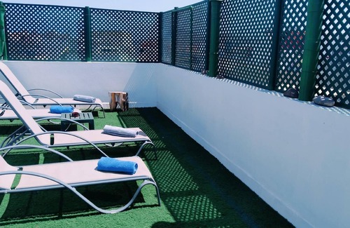 Dispondrá, sin salir a la calle, de un íntimo Solarium en el que el bronceado esta asegurado, con césped artificial, olvidate de los zapatos, también cómodas tumbonas y para el calor, una refrescante ducha.