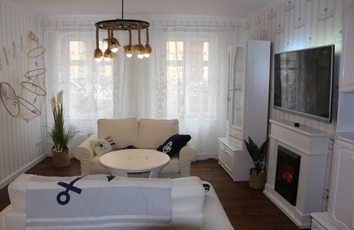 El apartamento está amueblado con estilo y no deja nada que desear. La sala de estar cautiva con sus acogedores muebles en Hampton Style (casa de playa marítima) con una chimenea eléctrica, un televisor de pantalla plana muy grande de Philipps y un rincón de juegos para los más pequeños. Los dos cómodos sofás se pueden usar como sofá cama. La moderna habitación en diseño en blanco y negro te permite soñar y la cama con somier ajustable eléctricamente y el televisor contribuyen a la relajación y la recreación. La vista deambula hacia la catedral con el foso en primer plano.