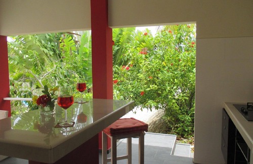 Relájate en la piscina compartida o tómate algo en el porche o patio hawaiano de este apartamento de 50 m².