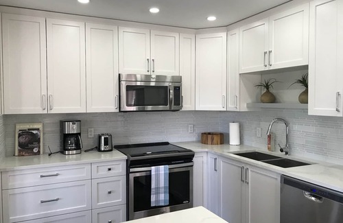 La cocina tiene todo lo necesario para la comodidad diaria durante su estancia. El alquiler también incluye lavadora y secadora de carga frontal, TV por cable y acceso WI-FI.