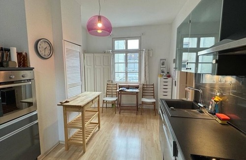 Los 75 metros cuadrados de espacio habitable se dividen en dos habitaciones, un gran salón, cocina, baño y dos balcones. Las alturas de las habitaciones de alrededor de 3,10 metros transmiten una generosa sensación de espacio. Se han conservado detalles históricos del equipo, como puertas de casete, ventanas, lámparas, pisos de madera y baldosas de cemento.