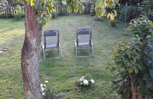 Sobre el amplio balcón de la cocina se accede al jardín vallado de aproximadamente 800 metros cuadrados, que puede utilizar para hacer barbacoas, relajarse o relajarse. Los niños pueden jugar aquí a su gusto.