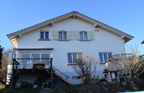 En el Vully, cerca de los lagos de Murten y Neuchâtel, apartamento lejos de la carretera, vista de los Alpes. Plaza de aparcamiento y jardín con barbacoa, juegos infantiles: columpios, ping-pong, trampolín, badmington, petanca, piscina disponible.